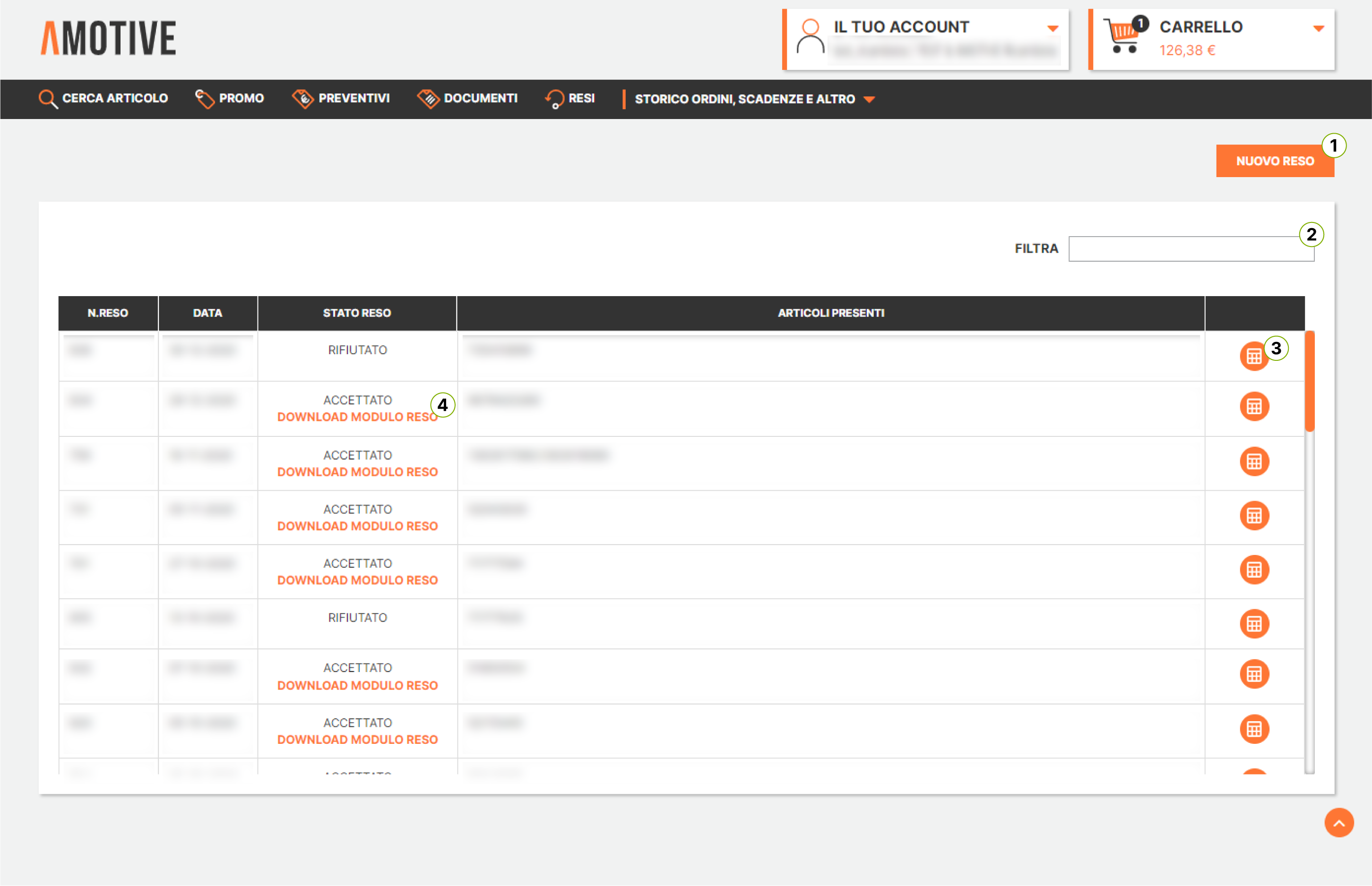 Per avviare la procedura di richiesta reso: accedi alla sezione Resi cliccando sulla voce Resi presente nella menu superiore del sito clicca sul tasto Nuovo Reso. Si aprirà la pagina di creazione del reso cerca l'articolo che vuoi rendere: puoi farlo ...