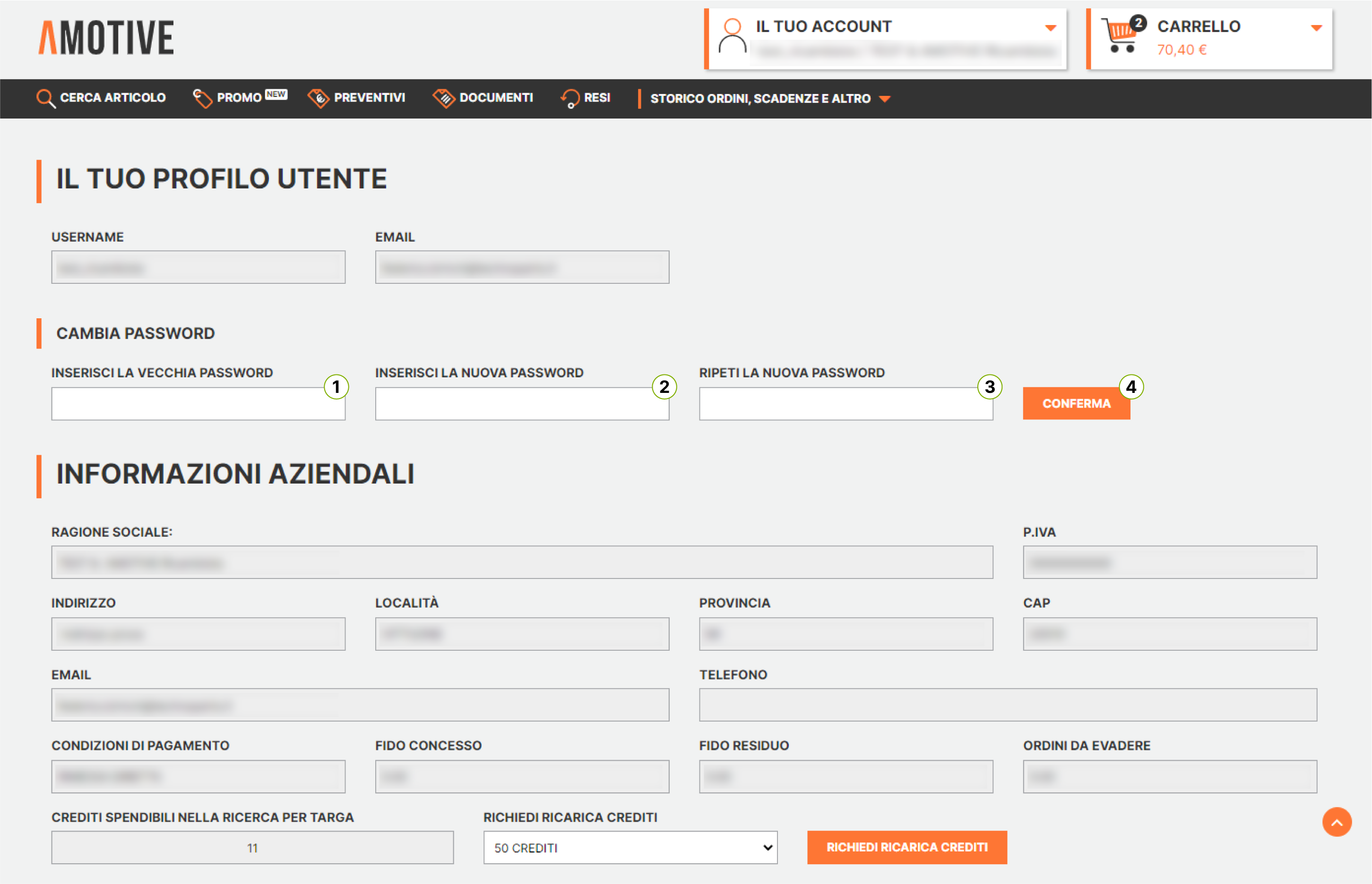 Se vuoi modificare le informazioni aziendali presenti all'interno del tuo profilo, scrivi ad info@amotive.it o apri un ticket dal nostro portale di assistenza. Per accedere al tuo profilo, segui questa guida: Accedere al proprio profilo utente