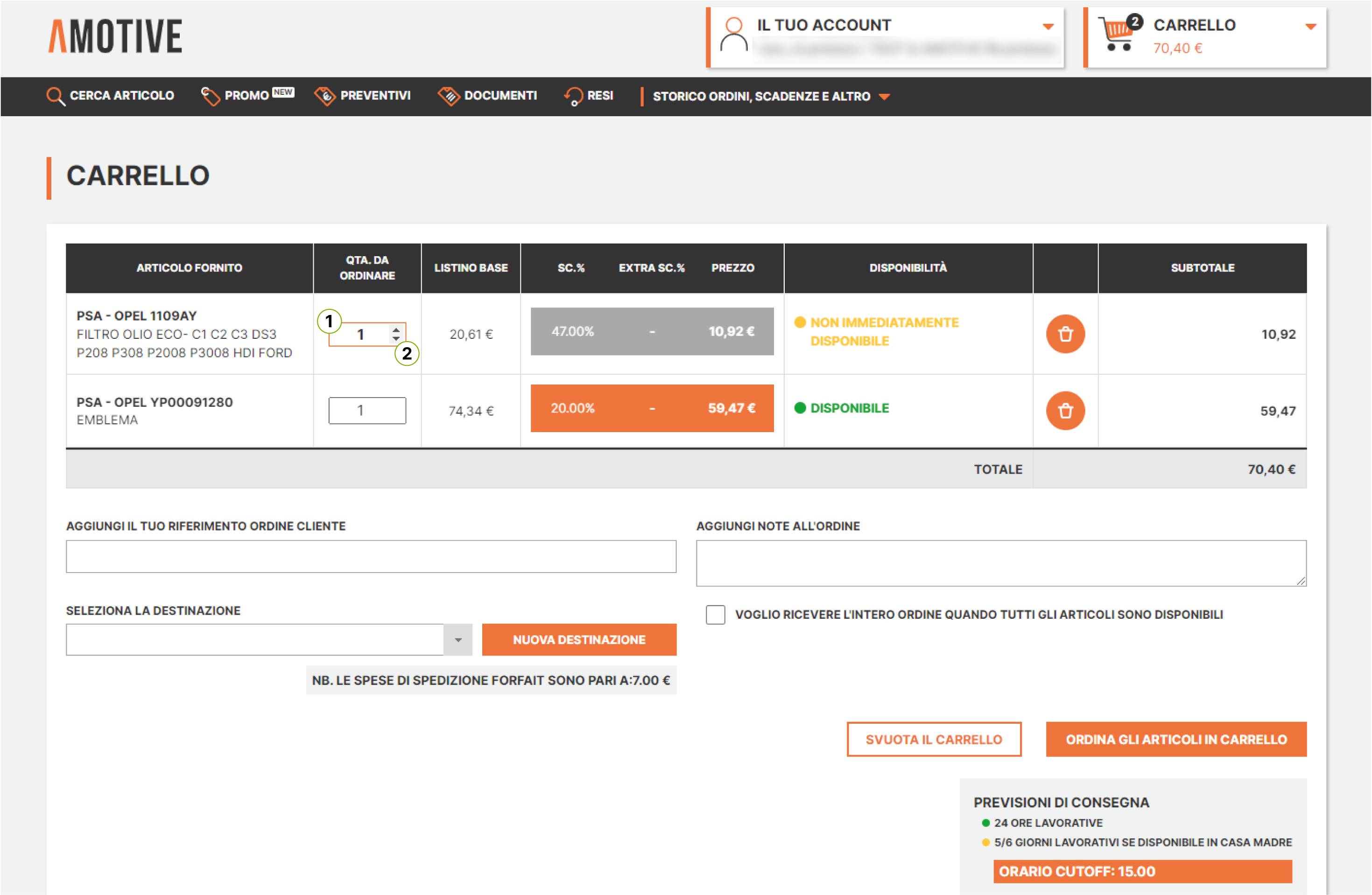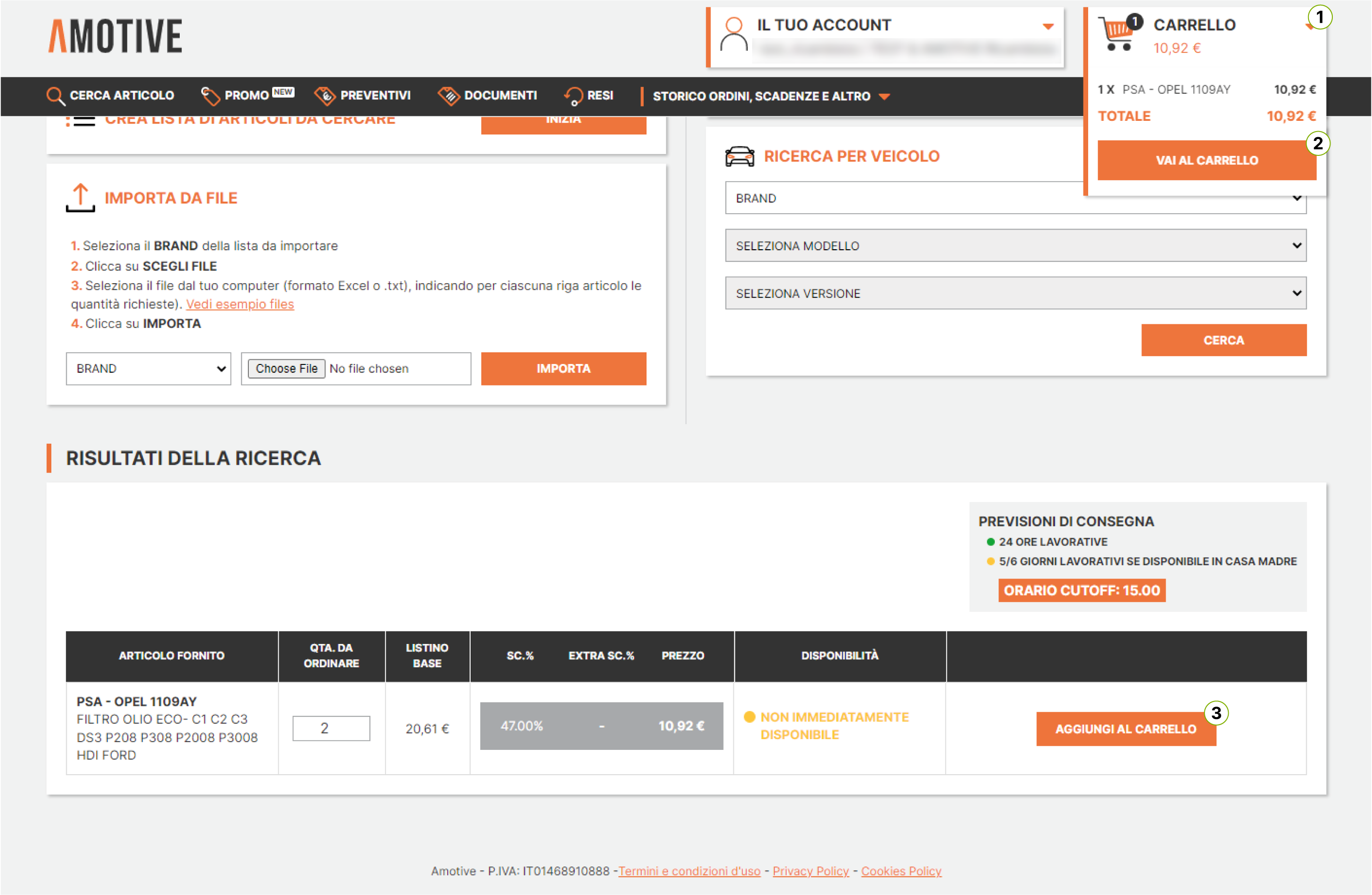 Dopo aver effettuato la ricerca tramite codici articolo o tramite il modello di un veicolo, è possibile visualizzare le disponibilità e aggiungere i prodotti al carrello. Per farlo: naviga alla maschera dei risultati di ricerca scegli la quantità da ...