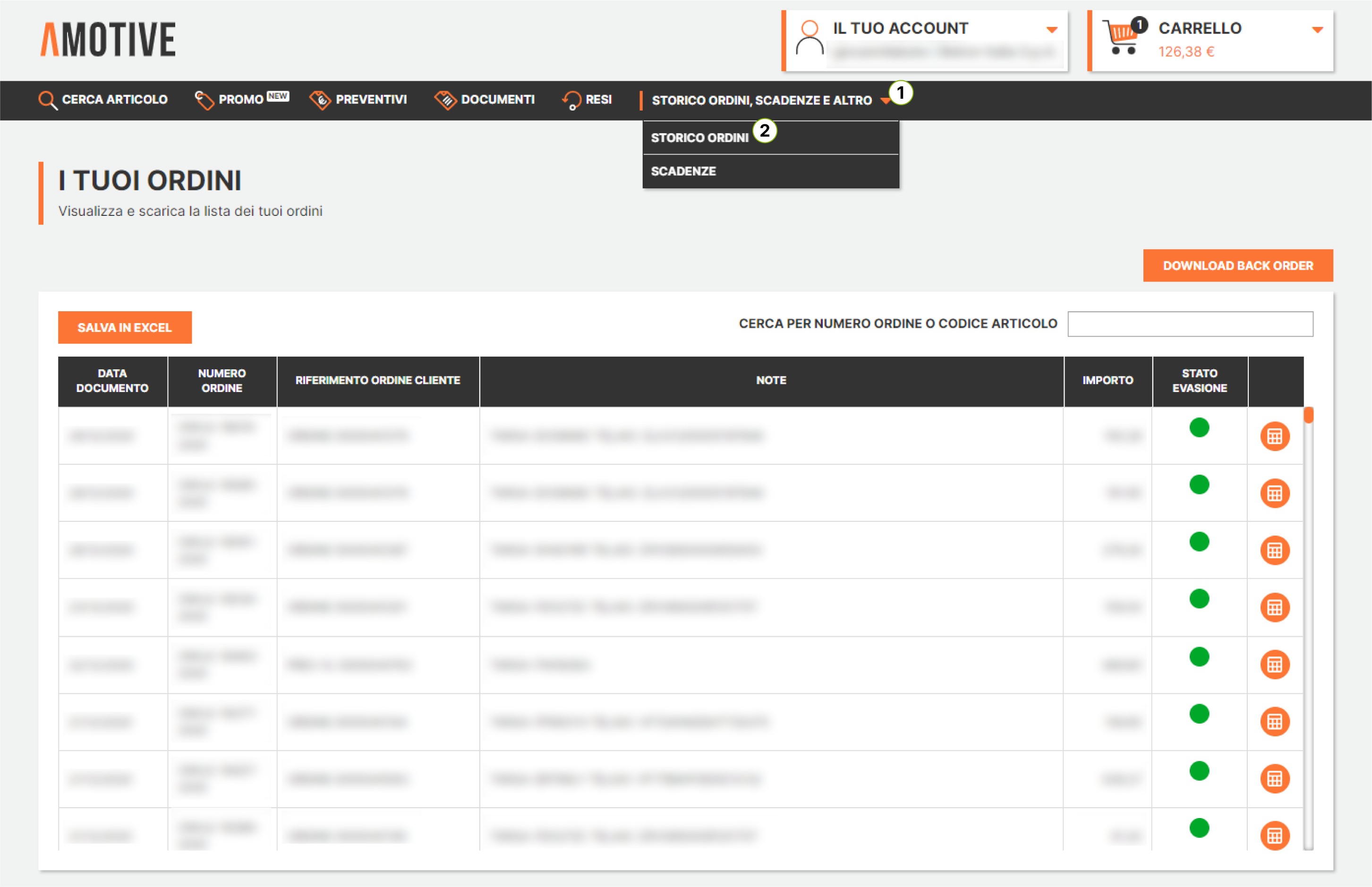 - clicca su Storico ordini, scadenze e altro sulla barra superiore